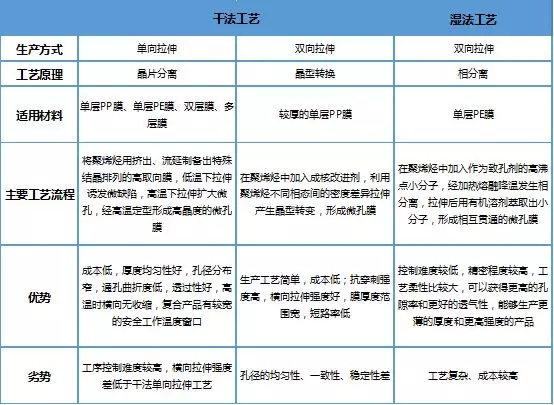 隔膜的生产工艺包括干法和湿法(见表1),由于干法双拉隔膜孔径的均匀性、一致性、稳定性差,只能用于中低端电池,因此并非主流的技术路线,目前隔膜的主流制备工艺是干法单拉和湿法。