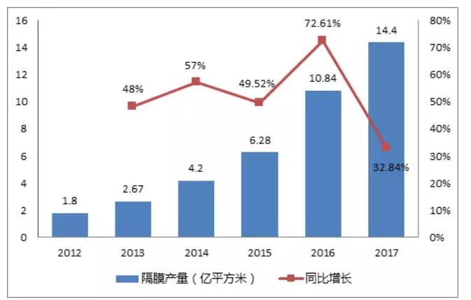 2017年,我国隔膜产量14.4亿平方米,同比增长33%,自2012年到2017年,国内隔膜产量年复合增长率达到68%。