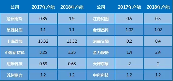 表2:2017-2018年国内主要湿法隔膜厂商产能(亿平方米)