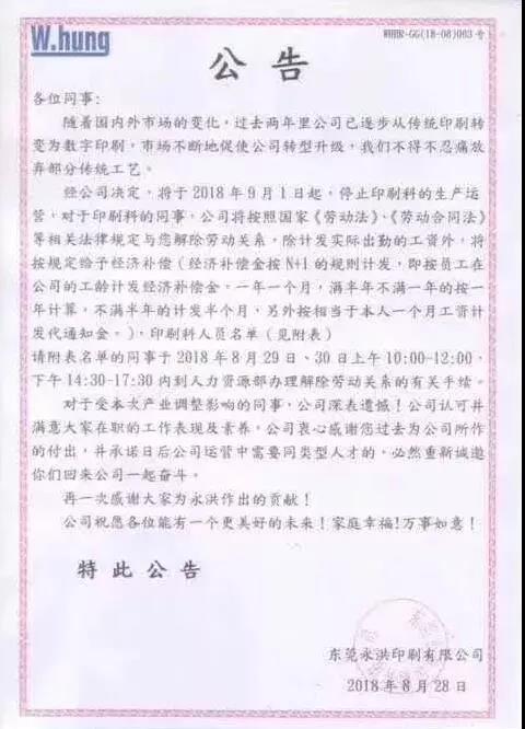”自2018年9月1日起,东莞永洪印刷有限公司将停止印刷科的生产运营,所有印刷科同事将解除劳动关系。”2018年8月28日,东莞永洪印刷有限公司向内部发布了这份公告: