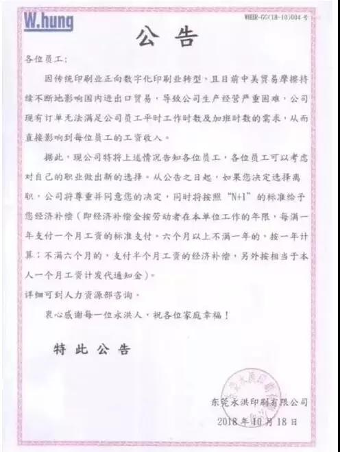 2018年10月18日,东莞永洪印刷发出第二封裁员公告,宣布对所有员工进行遣散,并将以“N+1”的赔偿方案进行经济补贴。