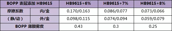○ 添加量少:80℃膜与金属的摩擦系数,6%HB9615=12%S&K,12%HB9615=18%S&K