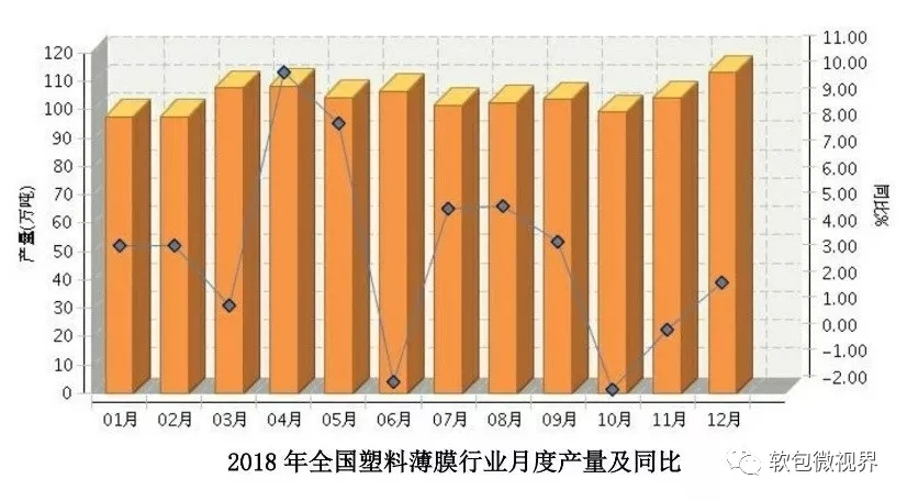 2018年1~12月,全国塑料薄膜行业累计完成产量1,180.36万吨,同比增长0.89%。 其中:12月份完成产量113.07万吨,同比增长2.21%。