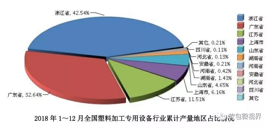 2018年1~12月,全国塑料加工专用设备行业累计完成产量28.55万台,同比增长-7.64%。产量排在前五位的地区依次是浙江省、广东省、江苏省、上海市、山东省。其中浙江省完成累计产量12.15万台(占42.54%),同比增长-7.68%;广东省完成累计产量9.32万台(占32.64%),同比增长-0.84%;江苏省完成累计产量3.29万台(占11 51%),同比增长2.74%;上海市完成累计产量 1.76 万台(占6.16%),同比增长1.18%;山东省完成累计产量133万台(占4.65%),同比增长-38.75%。
