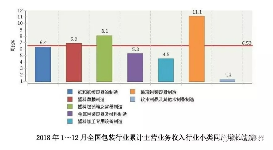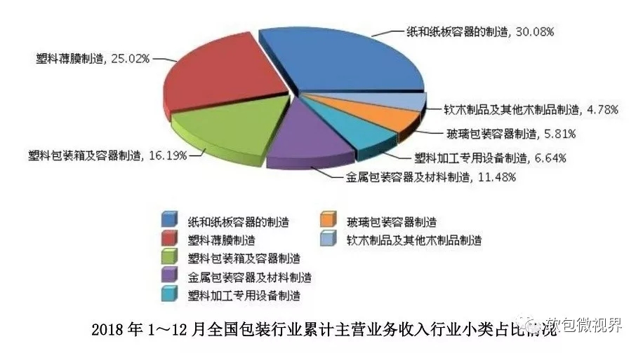 2018年1~12月,全国包装行业完成累计主营业务收入9,703.23亿元,同比增长6.53%。其中,纸和纸板容器制造完成累计主营业务收入2919.05亿元(占30.08%),同比增长6.35%;塑料薄膜制造完成累计主营业务收入2427.57亿元(占25.02%),同比增长6.9%;塑料包装箱及容器制造完成累计主营业务收入1571.35亿元(占16.19%),同比增长8.09%;金属包装容器及材料制造完成累计主营业务收入1114.07亿元(占11.48%),同比增长5.3%;塑料加工专用设备制造完成累计主营业务收入644.32亿元(占6.64%),同比增长4.5%;玻璃包装容器制造完成累计主营业务收入563.41亿元(占5.81%),同比增长11.1%;软木制品及其他木制品制造完成累计主营业务收入463.45亿元(占4.78%),同比增长1.26%。