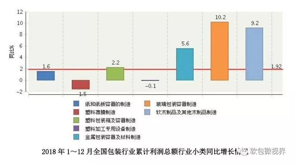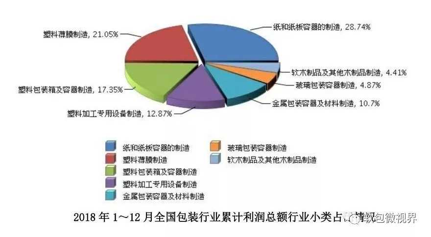 2018年1~12月,全国包装行业完成累计利润总额515.65亿元,同比增长 1.92%。其中,纸和纸板容器制造完成累计利润总额148.21亿元(占28.74%),同比增长1.58%; 塑料薄膜制造完成累计利润总额108.54亿元(占21.05%),同比增长-1.5%;塑料包装箱及容器制造完成累计利润总额89.46亿元(占17.35%),同比增长2.25%; 塑料加工专用设备制造完成累计利润总额66.35亿元(占12.87%),同比增长-0.06%; 金属包装容器及材料制造完成累计利润总额55.2 亿元(占10.7%),同比增长5.57%; 玻璃包装容器制造完成累计利润总额25.13亿元(占4.87%),同比增长10.17%;软木制品及其他木制品制造完成累计利润总额22.76亿元(占4.41%),同比增长9.17%。