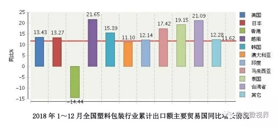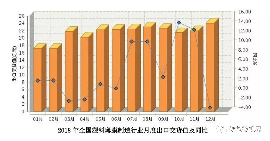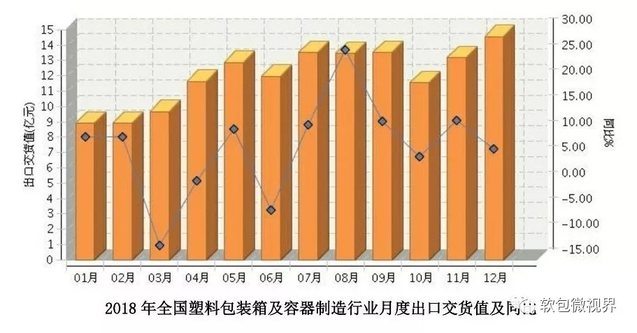 2018年1~12月,全国塑料包装行业累计完成出口额209.18亿美元,同比增长11.62%。