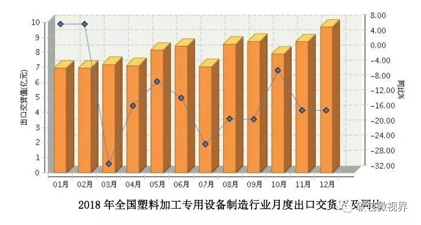 2018年1~12月,全国塑料加工专用设备行业累计完成出口额16.44亿美元,同比增长19.93%。