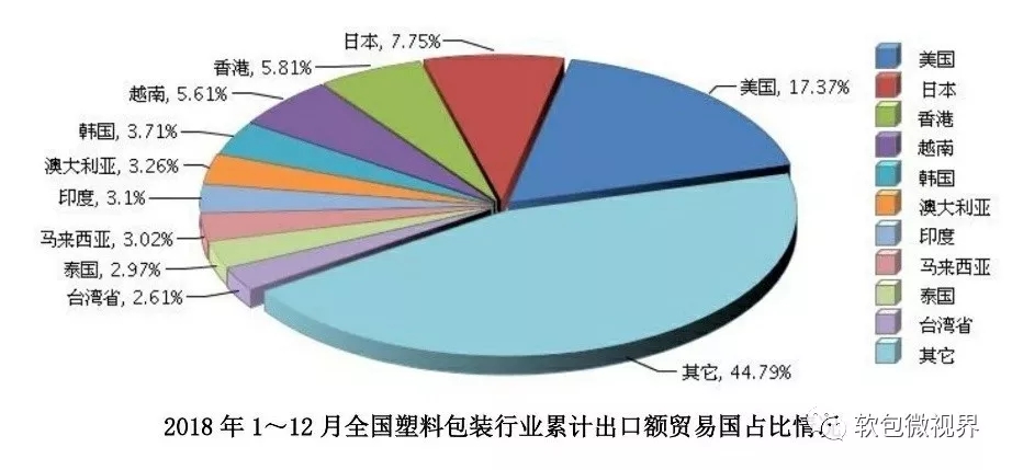 2018年1~12月,全国塑料包装行业完成累计出口额209.18亿美元,同比增长11.62%。出口额排在前五位的国家依次是美国、日本、香港、越南、韩国。其中:美国完成累计出口额36.33亿美元(占17.37%),同比增长13.43%;日本完成累计出口额16.21 亿美元(占7.75%),同比增长13.27%;香港完成累计出口额12.16亿美元(占5.81%),同比增长-14.44%;越南完成累计出口额11.73亿美元(占5.61%),同比增长21.65%;韩国完成累计出口额7.76亿美元(占3.71%),同比增长15.39%。