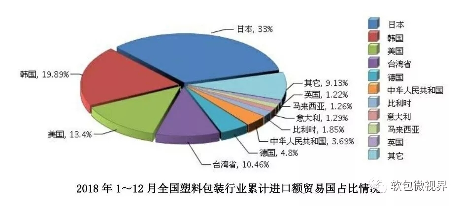 2018年1~12月,全国塑料包装行业完成累计进口额126.88亿美元,同比增长7.19%。进口额排在前五位的国家依次是日本、韩国、美国、台湾省、德国。其中:日本完成累计进口额41.88亿美元(占33%),同比增长6.71%;韩国完成累计进口额25.24亿美元(占19.89%),同比增长2.68%;美国完成累计进口额17.01亿美元(占13.4%), 同比增长7.58%;台湾省完成累计进口额13.28 亿美元(占10.46%),同比增长6.6%;德国完成累计进口额6.09亿美元(占4.8%),同比增长14.65%。