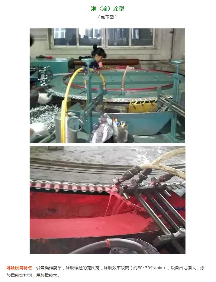 淋涂设备特点:设备操作简单,涂胶螺栓的范围宽,涂胶效率较高(约50~70个/min),设备占地偏大,涂胶量较难控制,用胶量较大。
