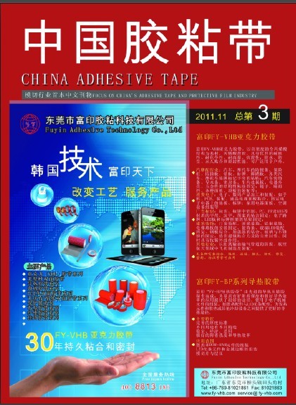 《中国胶粘带》杂志创刊于2010年11月份,具有国际、国内统一刊号,立足于胶带行业,包括保护膜。关注国内外模切厂商,实行市场化动作,是一本专门面向市场的专业胶粘带杂志。 内容为行业资讯、国内外行业动态、技术支持、厂商资料等。